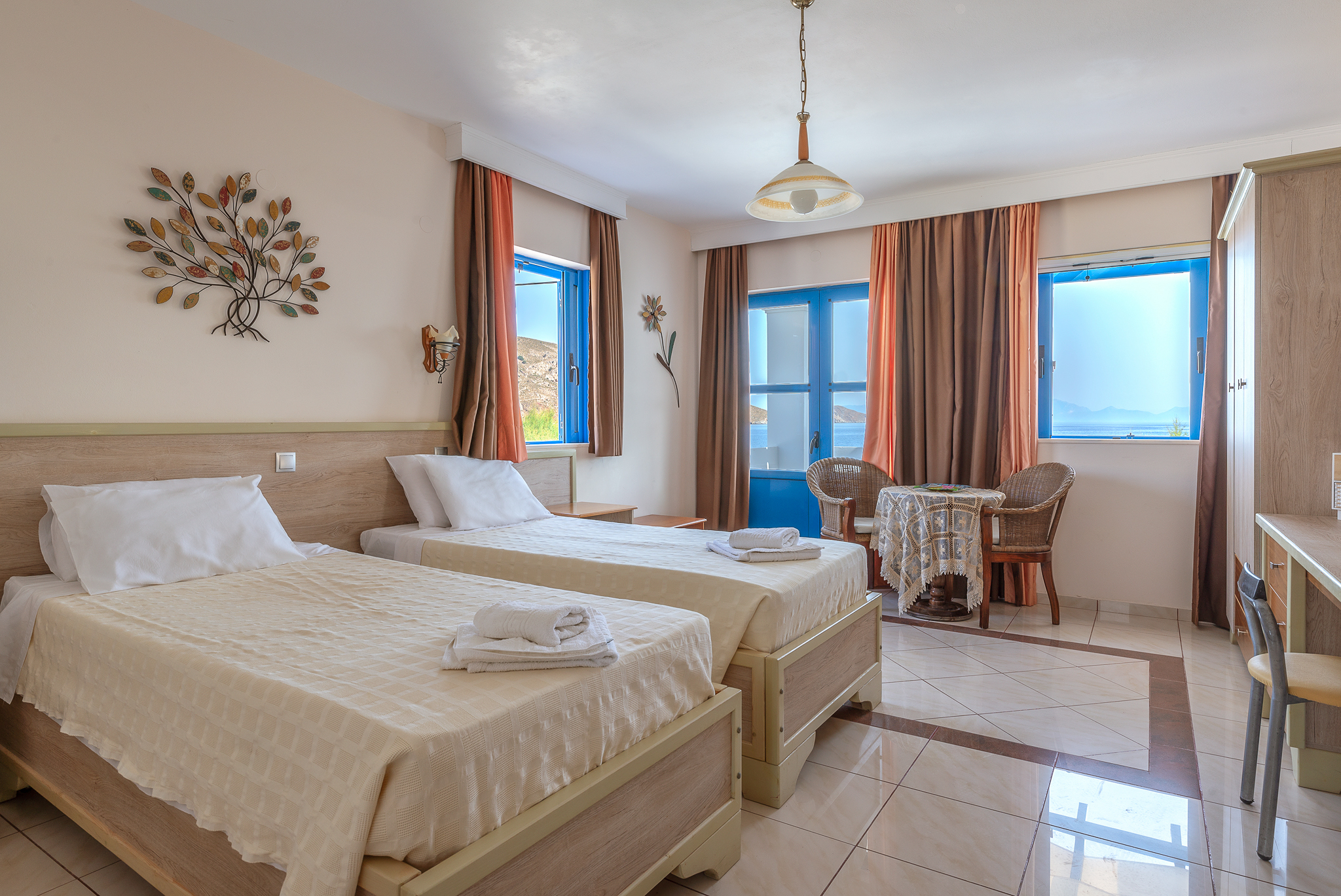 The suites have 2 large spaces, a main bedroom with a big doublebed, a hall, a bathroom with bathtubs like all the accomdations at Livadia Beach Apartments,and a seperate big space with a living room/kitchen and 2 sofabeds.