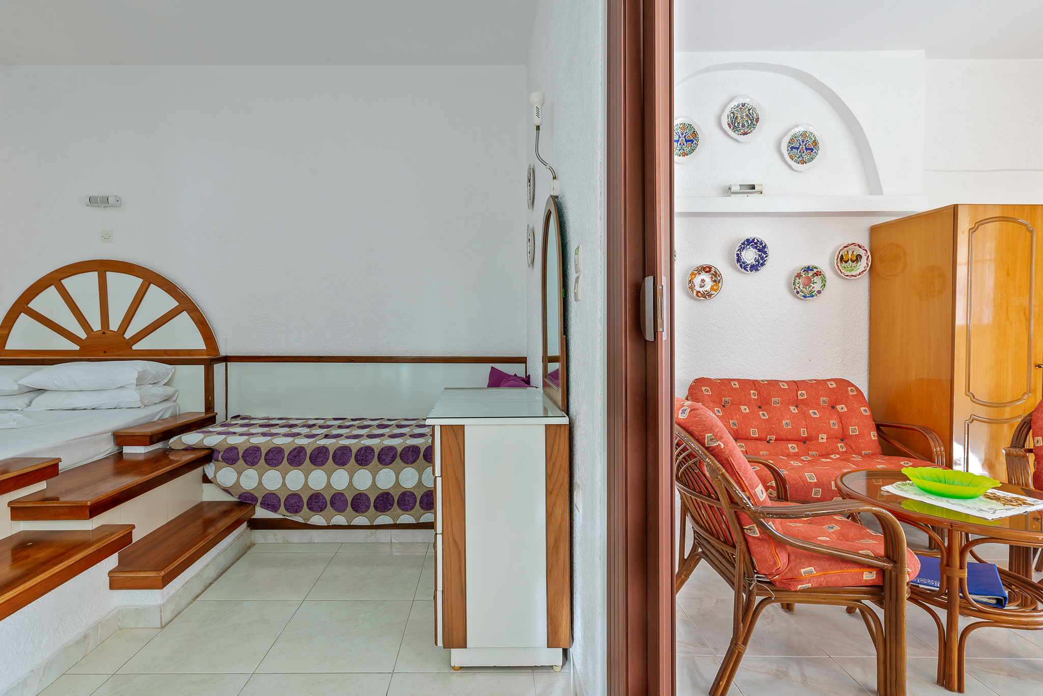 Each apartment has two big spaces, a main bedroom with double bed, a bathroom with shower and a separate space with a living room and fully equipped kitchen with fridgerator,stoves, utensils electrical appliances like toaster and water kettle.